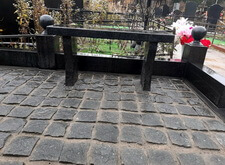Завершающим этапом стала сборка оградки и укладка брусчатки. Ограждение мы создали из находившихся на могиле секций, кое где закрепив отломавшиеся навершия на разделительные столбики. Перед памятником мы установили гранитный цветник и две траурные урны, а по правую сторону от входа поставили заказанную клиентом лавочку, тоже изготовленную из чёрного гранита. Брусчатку мы замыли водой, одновременно удаляя всю строительную пыль, образовавшуюся в процессе работы.