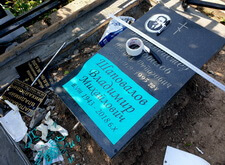 Изготовив трафарет, мы вновь вернулись на могилу и приступили к работе: первым делом мы тщательно пропололи участок, а затем демонтировали надгробья для более удобного нанесения надписи.